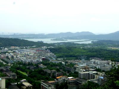 Der Xi Hu (West Lake) von oben. Das bewaldete Gebiet unten links ist der Campus.